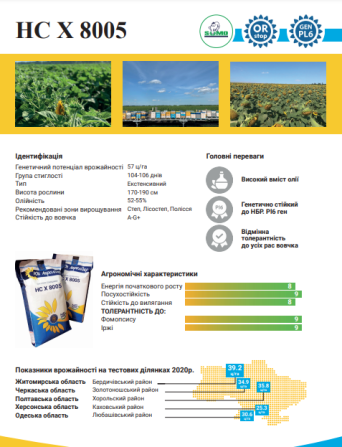 Гібрид підсоняшника НС Х 8005 є новим представником гібридів сербської селекції нового покоління, який повністю пристосований для вирощування в українських кліматичних та ґрунтових умовах за використання технології SUMO. Цей гібрид належить до масличних гібридів екстенсивного типу та відрізняється в...