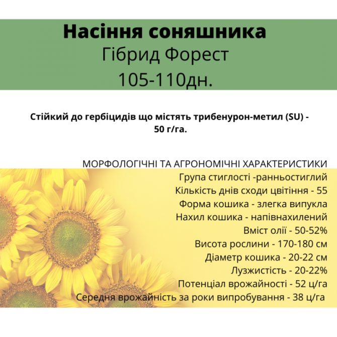 **Технічний опис гібридного насіння соняшнику** **Особливості гібриду** Гібрид соняшнику володіє стійкістю до дії гербіцидів, що містять трибенурон-метил (SU) у концентрації 50 г/га. Цей гібрид представляє собою рослину помірно інтенсивного типу з високою толерантністю до хвороб кошика та листя. В...