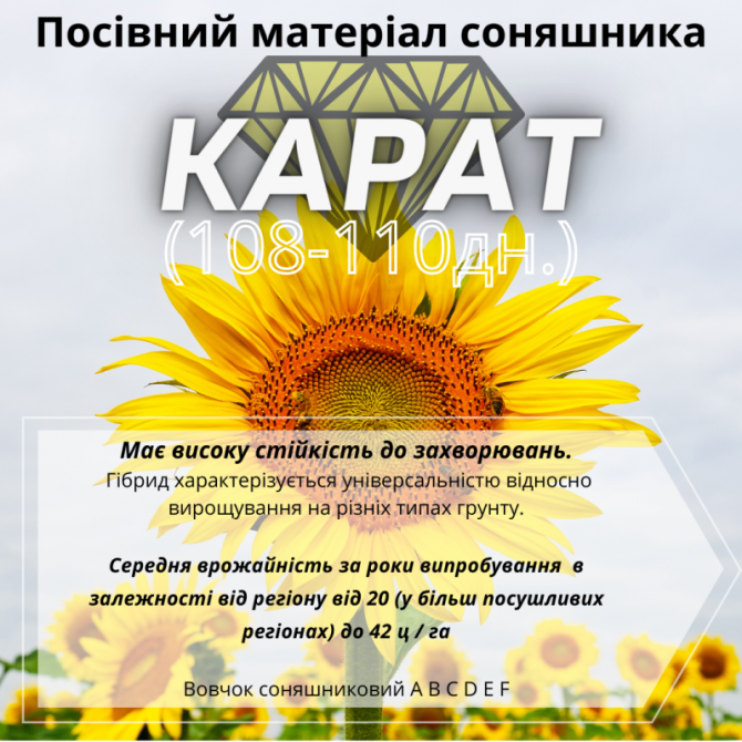 Гібрид соняшнику КАРАТ: детальний технічний опис Гібрид соняшнику КАРАТ є стійким до гербіцидів, що містять трибенурон-метил (SU), і відрізняється високою стійкістю до захворювань. Цей гібрид проявляє універсальність у вирощуванні на різних типах ґрунту. Сортовипробування гібриду проводяться з 2017...