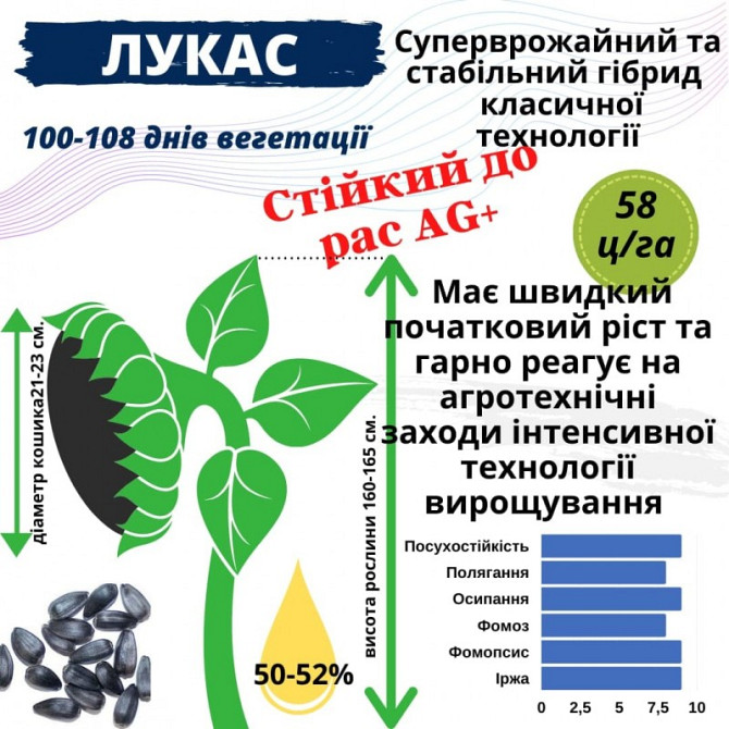 Сорт: Середньоранній Термін вегетації: 110-113 днів Висота рослин: 170-180 см Діаметр китиці: 22-24 см Маса 1000 насінин: 55-60 г Вміст олії: 48-50% Потенційний врожай: 38-45 ц/га Стійкість: - Стійкість до посухи: 7 - Стійкість до фомозу: 9 - Стійкість до фомопсису: 9 - Стійкі...