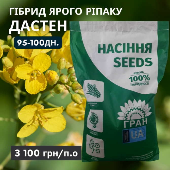 ## Технічний Опис Гібриду Ярого Ріпаку "Дастер" від Української Селекції НК «ГРАН» ### Упаковка: 1 пакет-мішок місткістю 1,5 мільйона насінин (достатньо для посіву 2 гектарів) ### Норма висіву: - Ранній посів (28.03-05.04): 650-700 тисяч насінин - Оптимальний посів (06.04-10.04): 700-750 тисяч нас...