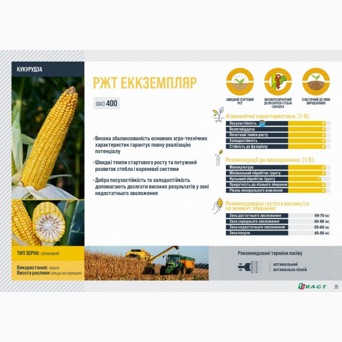 **Сорт кукурудзи РЖТ ЕККЗЕМПЛЯР** **Опис продукту:** Кукурудза РЖТ ЕККЗЕМПЛЯР є середньопізнім гібридом кукурудзи, призначеним для вирощування зерна. Цей сорт відзначається високою збалансованістю основних агротехнічних характеристик, що гарантує повне використання його потенціалу. **Технічні хара...