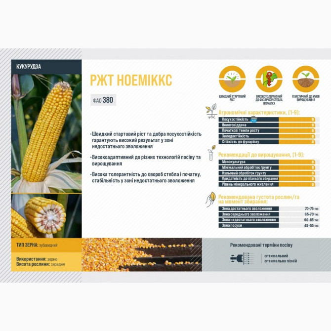 Кукурудза-РЖТ НОЕМІККС відноситься до середньостиглої групи зернових культур і має FAO 380. Цей сорт кукурудзи відомий своїм швидким стартовим ростом та відмінною посухостійкістю, що гарантує високі врожаї в умовах обмеженого зволоження. Він високоадаптивний до різних технологій посіву та вирощуванн...