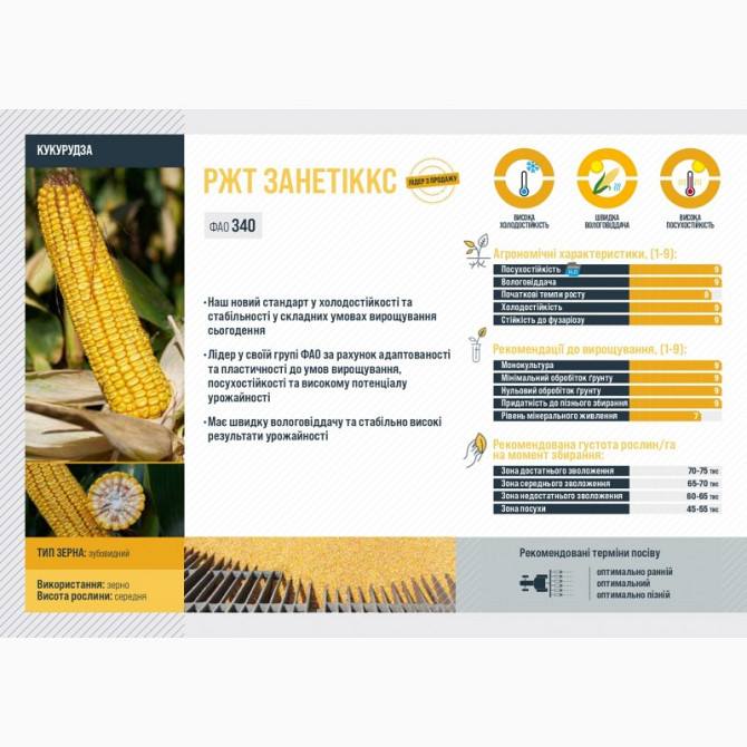 Кукурудза РЖТ ЗАНЕТІКК: Технічний Опис та Агрономічні Характеристики **Тип використання:** Зерно **Група стиглості:** Середньостигла **Група FAO:** 340 Кукурудза РЖТ ЗАНЕТІКК є новим стандартом у холодостійкості та стабільності вирощування в умовах сьогодення. Цей гібрид виявляється лідером ...