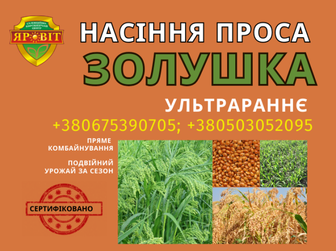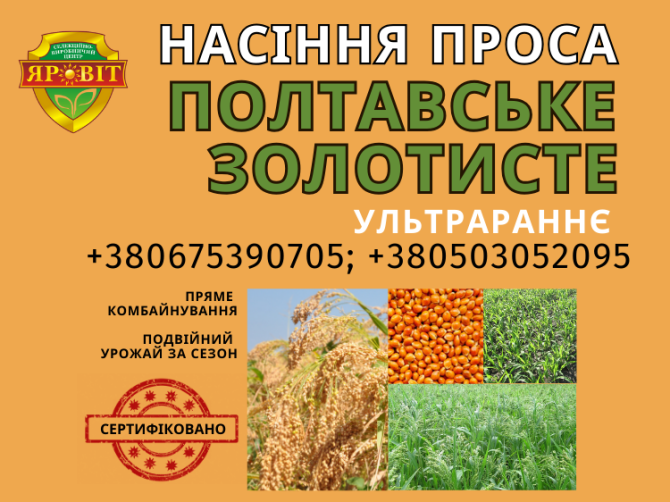 **Опис продукту:** **Сорт проса "Полтавське золотисте"** Сорт проса "Полтавське золотисте" є представником ультра раннього періоду вегетації, що триває 55 днів. Цей сорт відомий своєю високою врожайністю та стійкістю до неблагоприятних умов. **Характеристики продукту:** - **Тип сорту:** Ультра ...