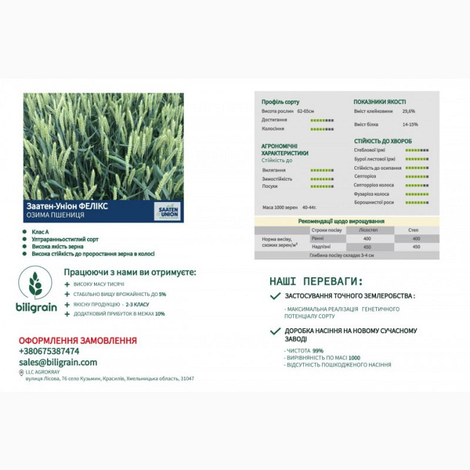 Підприємство пропонує насіння озимої пшениці різних сортів, таких як Наснага, Пилипівка, Журавка Одеська, Кубок, Шестопаловка, Бория, Золотоколоса, Смуглянка, Катаріна, Фелікс, Румор, Платін, Ванесса, Богемія та Леннокс. Озима пшениця є одним з найважливіших культурних рослин у сільському господар...