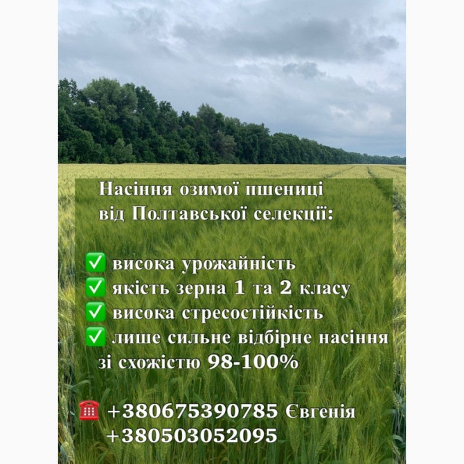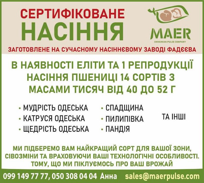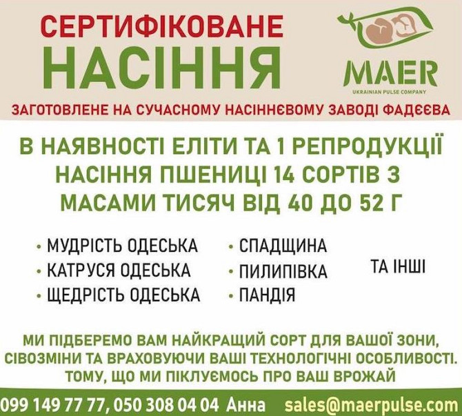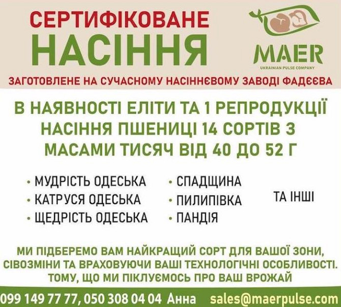 Пшениця озима - сорти: Астарта, Благодарка, Богдана, Ліга, Оранта, Подолянка, Фортеця, Шестопалівка. У наявності такі сорти та репродукції: 1-репродукція еліта. Сорти: Астарта, Богдана, Благодарка Одеська, Катруся Одеська, Ліга Одеська, Мудрість Одеська, Оранта Одеська, Подолянка, Шестопалівка, Фор...