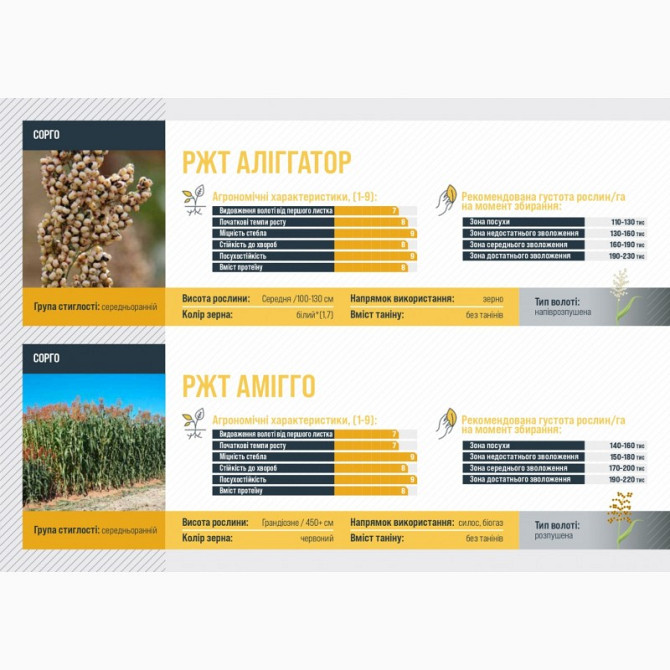 **Технічний опис сорго-гібриду "РЖТ АЛІГГАТОР"** **Тип використання:** Зерно **Група стиглості:** Середньорання **Колір зерна:** Білий **Висота рослини:** Середня, від 100 до 130 см **Тип волоті:** Ніпіврозпушена **Вміст таніну:** Відсутній **АГРОНОМІЧНІ ХАРАКТЕРИСТИКИ (від 1 до 9):** - Видов...