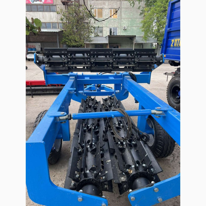 Характеристика продукту "Мульчуючий коток КМ": - Тип: причіпний мульчуючий коток; - Робоча ширина захвату: 5,88 м; - Діаметр барабана: 325 мм; - Діаметр барабана з ножами: 520-550 мм; - Кількість ножів: 84 шт; - Розміри ножів: 180х500 мм; - Кут різання: 45 градусів; - Труба рами: 150х100х8 мм; - Ре...
