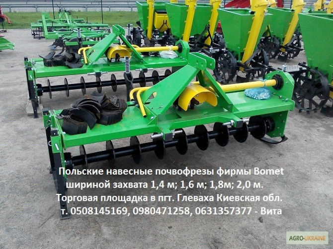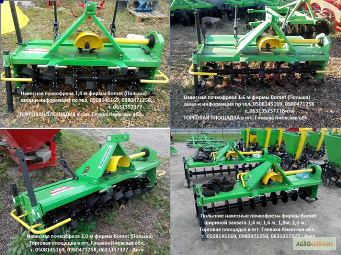 Продаються навісні почвофрези від компанії Bomet (Польща) з шириною захоплення 1,2 м, 1,4 м, 1,6 м, 1,8 м та 2,0 м. Навісна почвофреза призначена для розрідження та перемішування шарів ґрунту без обертання. Фреза розбиває глечики, обрізає стебла та корені бур'янів, дозволяючи швидко завершити підгот...