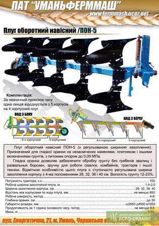 **Технічний опис Плугоборотного ПОН-5.0** Плуг ПОН-5.0 є п'ятикорпусним обладнанням із регульованою шириною захвату, призначеним для гладкої вспашки ґрунту на глибину до 30 см. Він призначений для використання на засмічених камінями, дерев'яними гілками та іншими включеннями ділянках ґрунту з наван...