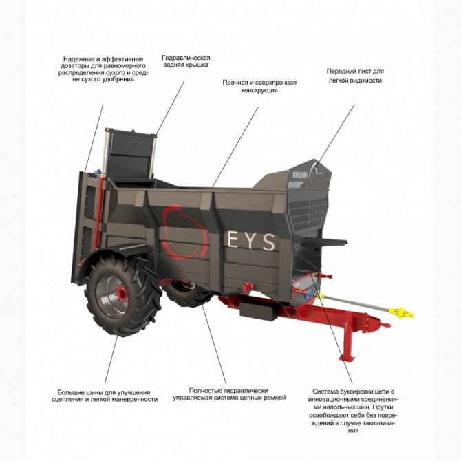Розкидач твердих частинок EYS дозволяє максимально ефективно використовувати гній і максимально ефективно використовувати поживні речовини в полі. з вашими потребами. Особливості Система вертикального спірального дозатора - простота рівномірного розподілу добрив, оброблених в сепараторі або втрачені...