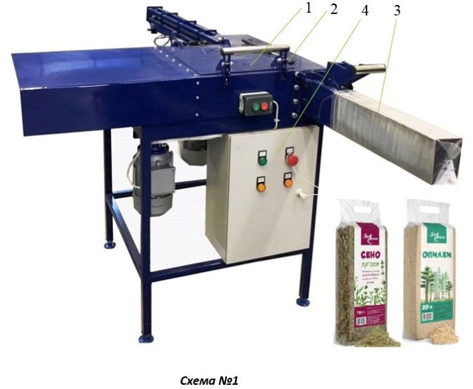 Машина призначена для фасування та упакування сіна та деревного опили на готові полімерні пакети з підпресуванням у формі паралелепіпеда. **Технічні характеристики:** - Доза: 1 кг/12л ±5% (для опилок), 400-600 ±5% г (для сіна) (відповідно до технічного завдання); - Виконання: напівавтоматичне; - Пр...
