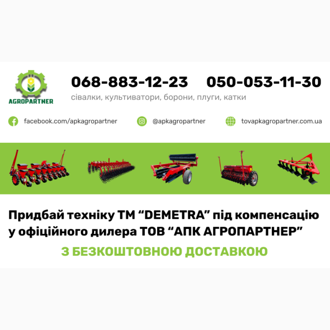 Компанія "АПК АГРОПАРТНЕР" є офіційним дилером торгової марки "Деметра" і спеціалізується на постачанні сільськогосподарської техніки з безкоштовною доставкою по всій території України. Наш асортимент включає в себе широкий вибір сільськогосподарської техніки, зокрема: сівалки, культиватори, поворот...