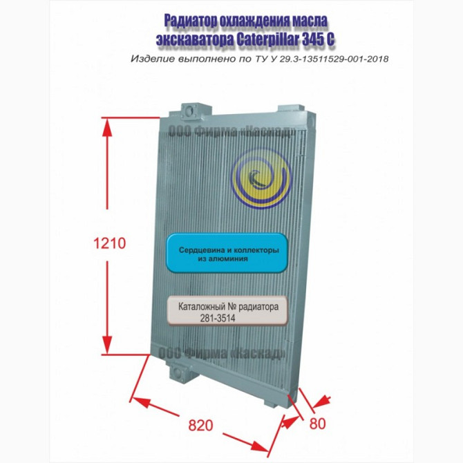 Радіатор мастильний Caterpillar 345 C Радіатор охолодження двигуна, виготовлений ТОВ "Фірма «Каскад»", є аналогом радіатора, що широко використовується на спецтехніці. Каталожний номер 281-3514В. У виробі використовуються серцевина і колектора з алюмінію. Технічні параметри відповідають ТУ У 29.3-1...