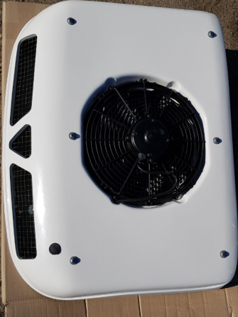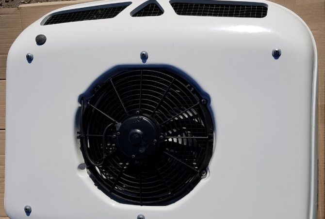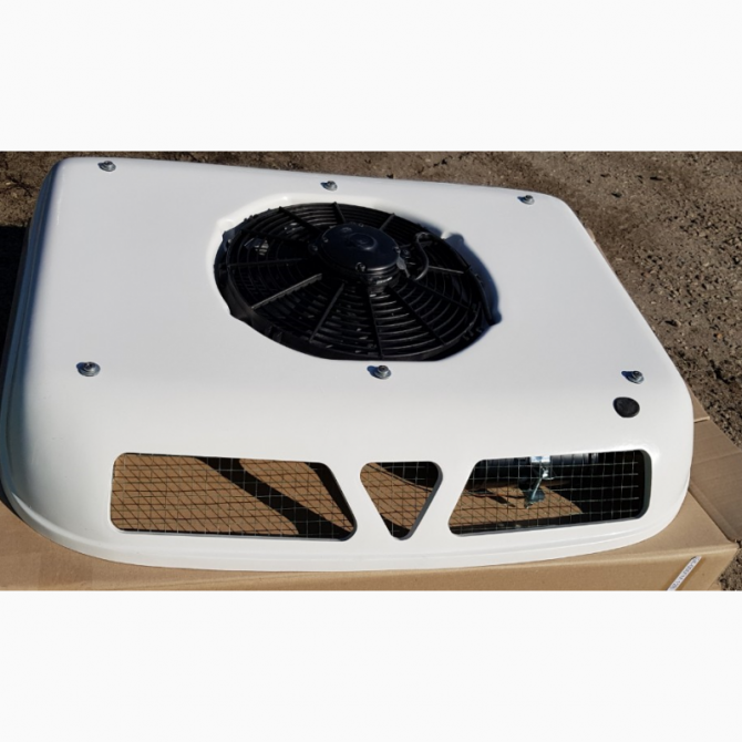 Конденсаторний блок складається: - конденсатор алюмінієвий, - фільтр-осушувач ресивер горизонтальний, - датчик тиску, - вентилятор, - проводка, реле. Робоча напруга вентилятора обдува конденсатора 12/24.