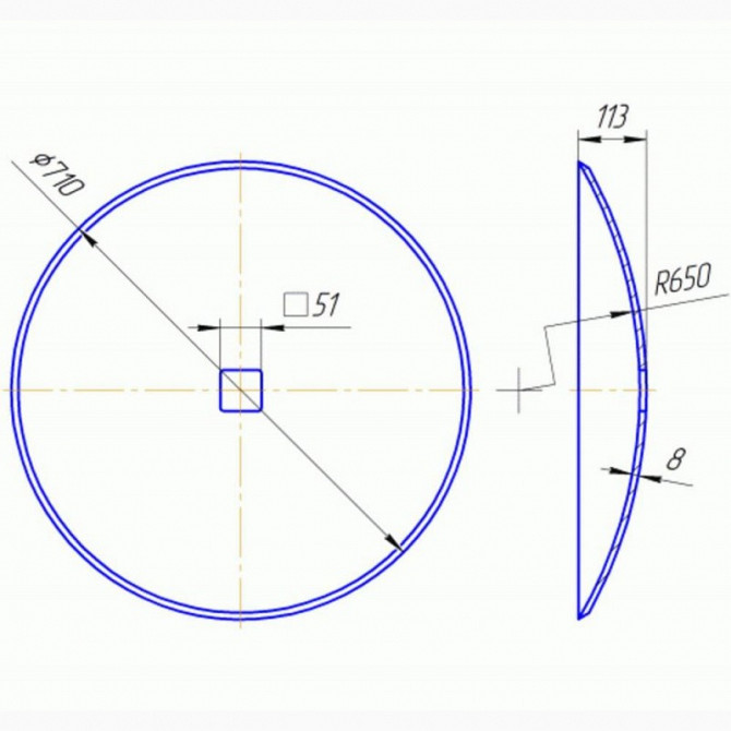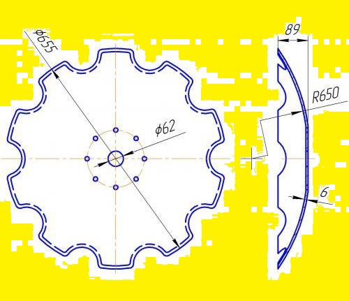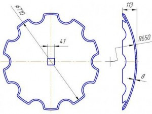 Якість продукції не поступається імпортним аналогам! Диск виготовлений з листової сталі товщиною 10мм., має 15 зубів, радіус півсфери 600мм., внутрішній квадрат 51х51мм., висота опуклості 135мм. (колишній ГОСТ) Переваги: - Використовується рессорно-пружинна сталь марки 65Г або її аналоги із вмістом ...