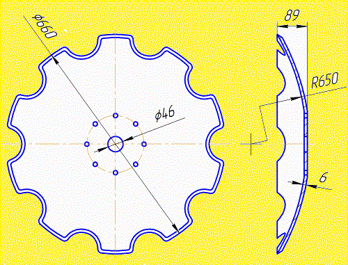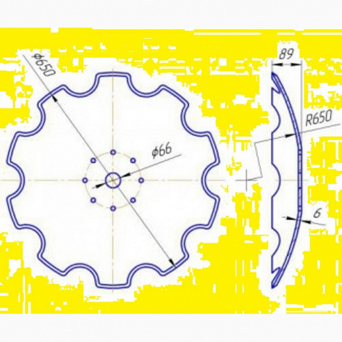 Дискборони вирізний, зовнішній діаметр 660 мм, внутрішній отвір діаметром 46 мм, 8 отворів під маточину діаметром 11 мм, 10 зубів, товщина 6 мм. Також виготовляємо під замовлення зубчастий диск діаметром 600 мм. (різновид борони).Виробництво засноване на технологіях Державного стандарту України! (ко...