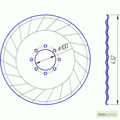 Якість та гарантія від виробника.Реальна конкуренція імпорту!-Диск сівалки, фреза, зовнішній діаметр 432 мм, внутрішній отвір діаметром 100 мм, 8 отворів діаметром 13 мм. під два типи маточок (4 отв. на діаметрі 133 мм і 4 отв. на діаметрі 126 мм), хвиляста кромка, товщина 5 мм, вага 5,5 кг. - Можли...
