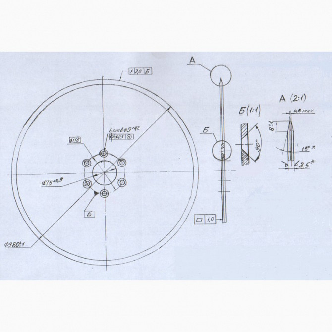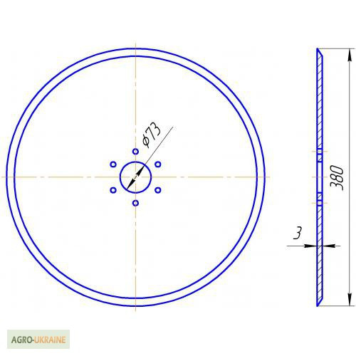 Реальна конкуренція імпорту! Вища якість України! Диск сівалки 380 мм., вн. ǿ 74,5 мм., 5 відп. ǿ 8 мм., товщ. 5 мм., Диск сівалки Ǿ 406 мм., вн. ǿ 74,5 мм., 6 відп. ǿ 8 мм., товщ. 5 мм. Можливе виготовлення з металу товщиною 4 та 6 мм. Для виробництва робочих органів ми використовуємо ресорно-пружи...