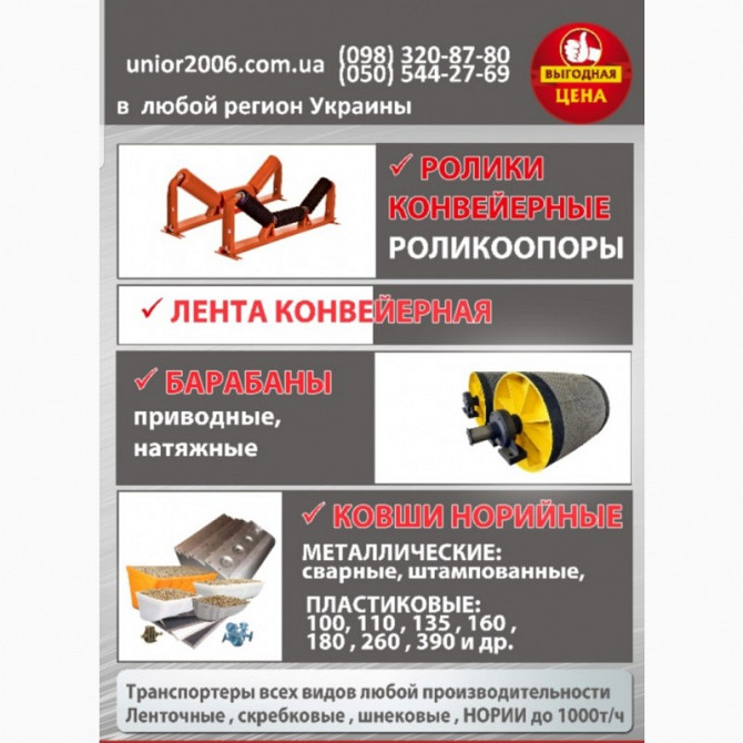 Наше підприємство виготовляє роликоопори для транспортерів, перехідні, амортизуючі, підтримуючі, дефлекторні. Длястрічкових транспортеріввід 320 мм до 1600 мм.Швидкі терміни виготовлення. Більше інформації: elevator.to4ka.funВаш менеджер Анна