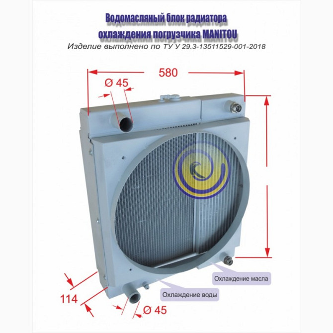 Водомасляний блок радіатора охолодження для погрузчика MANITOU, виготовлений ООО фірмою «Каскад», є аналогом радіатора, що широко застосовується на спецтехніці. У виробі використовується мідьно-латунне серцевина та колектори зі сталі. Технічні параметри розроблені відповідно до ТУ У 29.3-13511529-00...