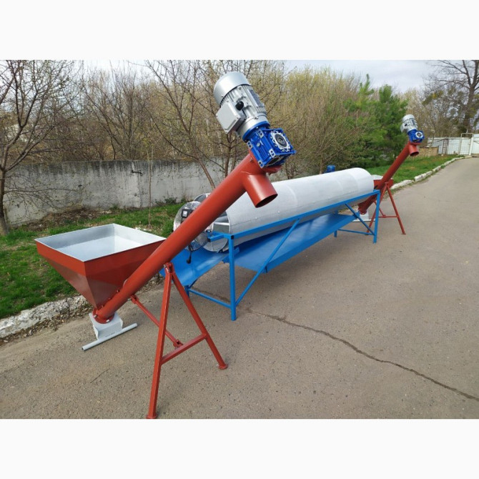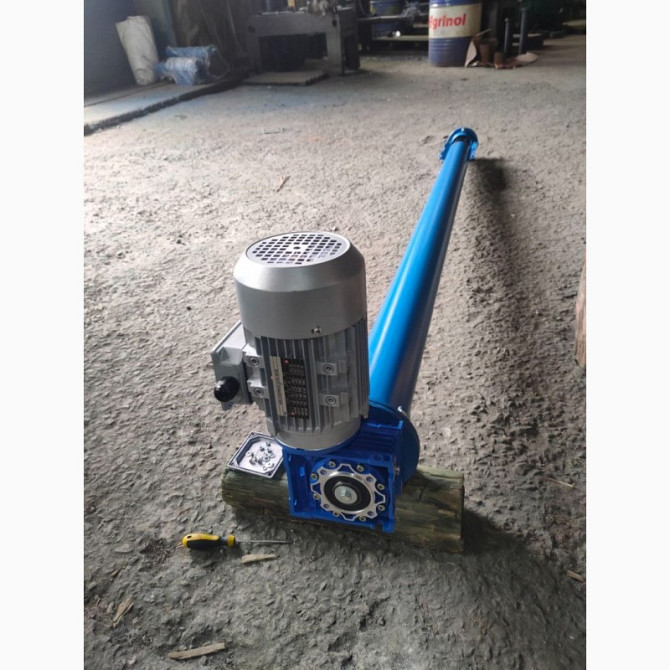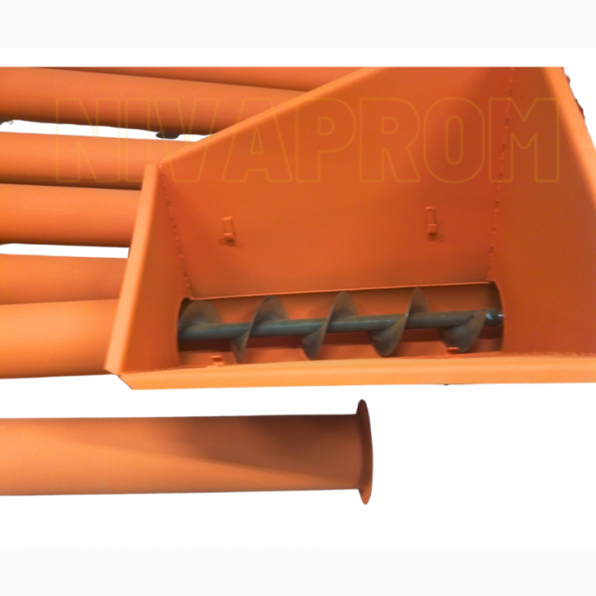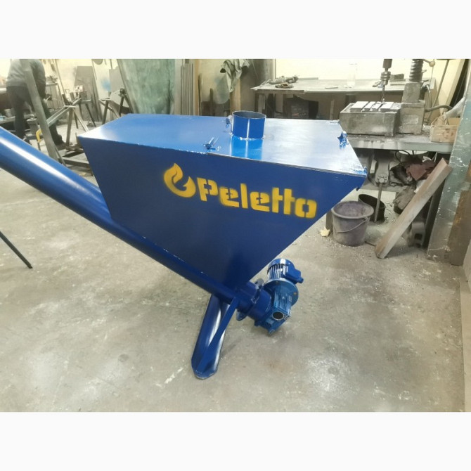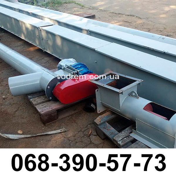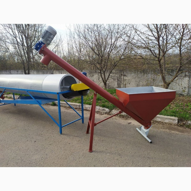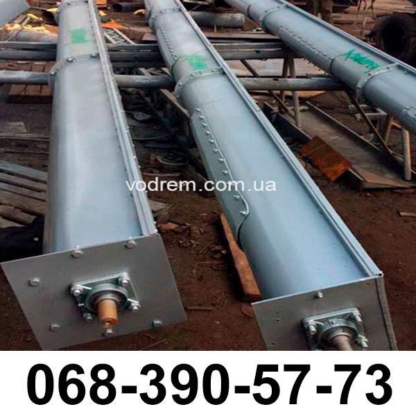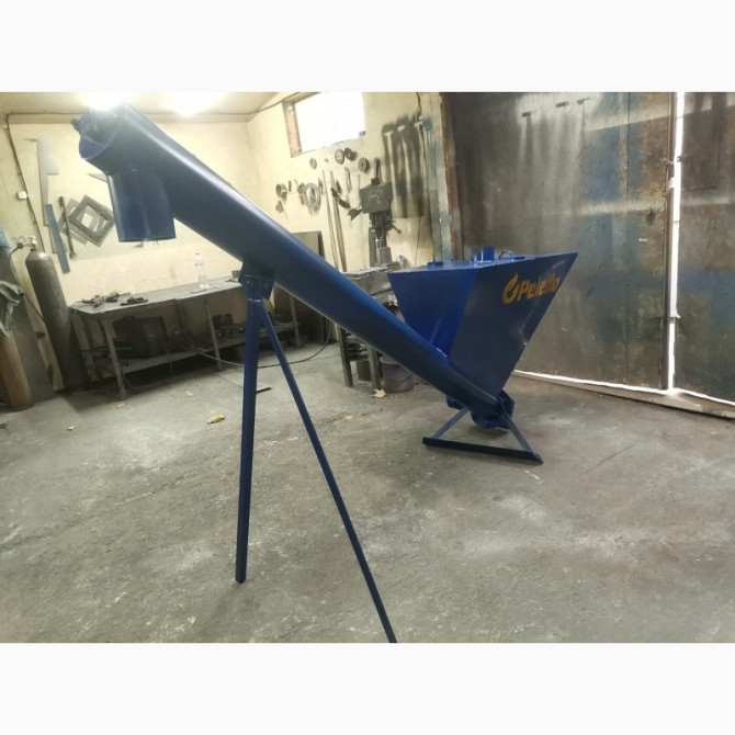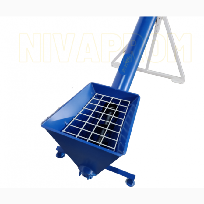 Шнековий транспортер з бункером Шнекові транспортери призначені для перевезення зерна та подібних за характеристиками матеріалів (комбікорму, відрубів та інших) по горизонтальних або нахилених напрямках. Переміщення продукту відбувається в закритому жолобі шнекового транспортера вздовж осі спіральн...