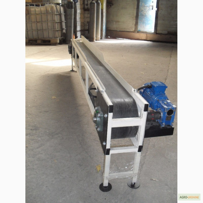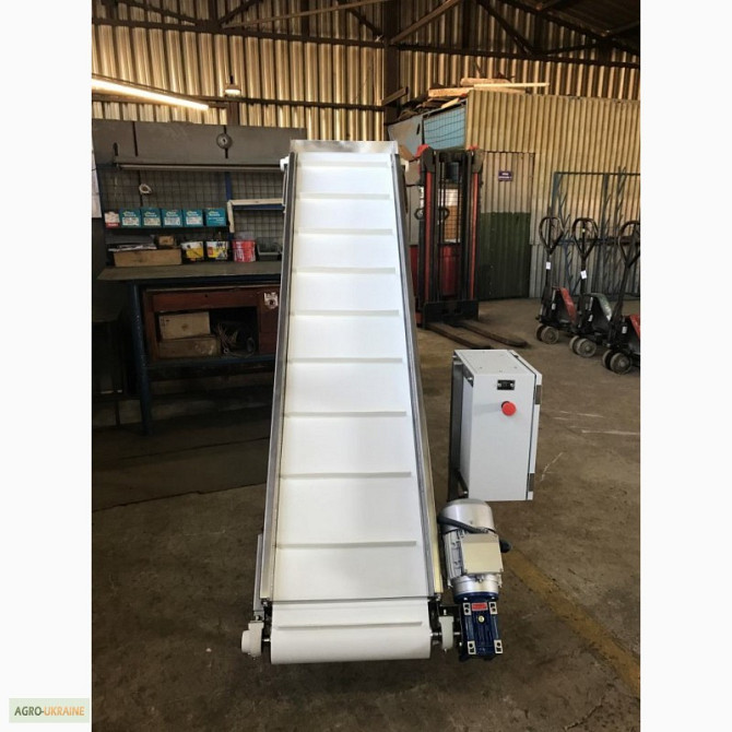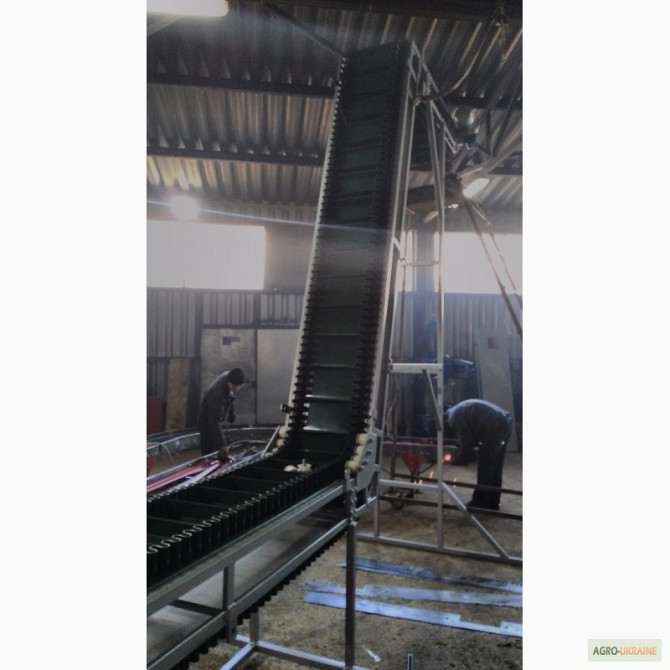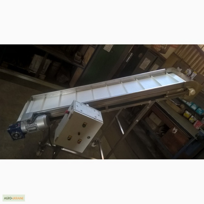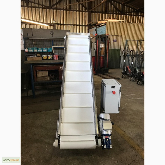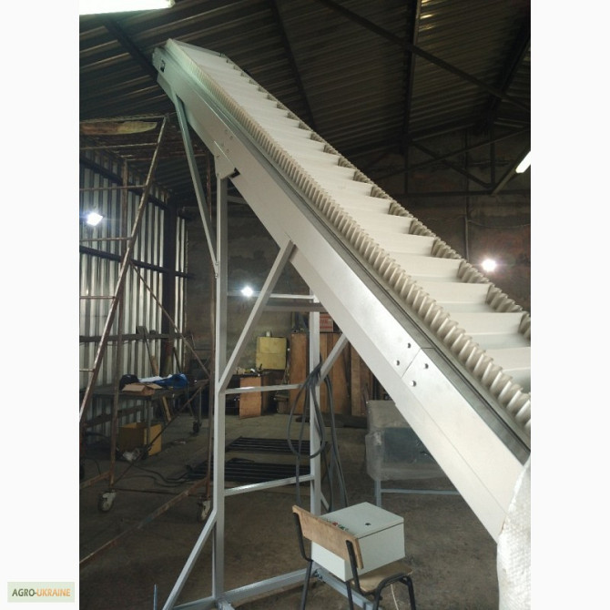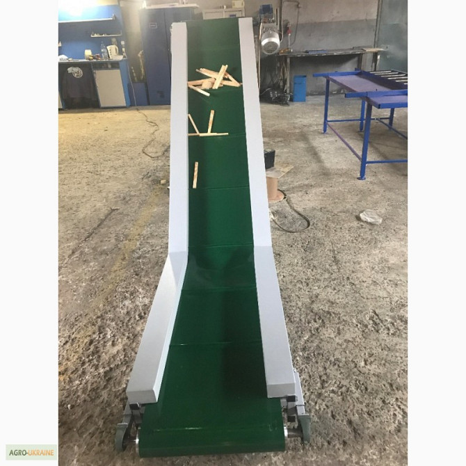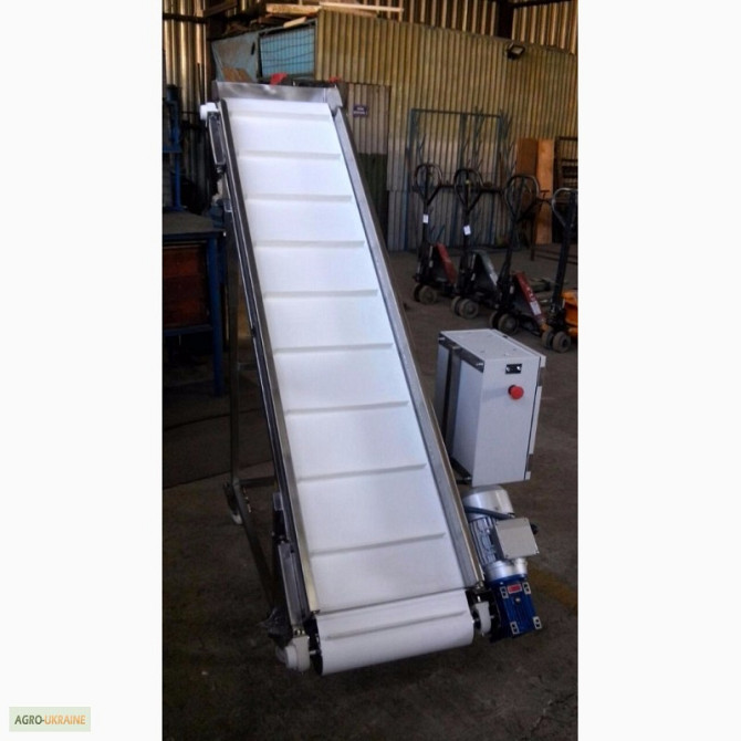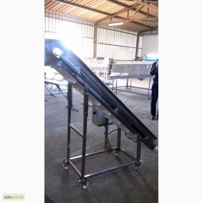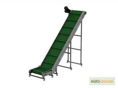 Транспортер призначений для підйому негабаритного вантажу з такими характеристиками: - Довжина горизонтальної частини конвеєра 1100 мм; - Довжина підйомної частини конвеєра 2000 мм; - Висота завантаження 180 мм; - Висота вивантаження 1500 мм; - Лента із шевроном (висота 25 мм, крок шевронів 400 мм)...