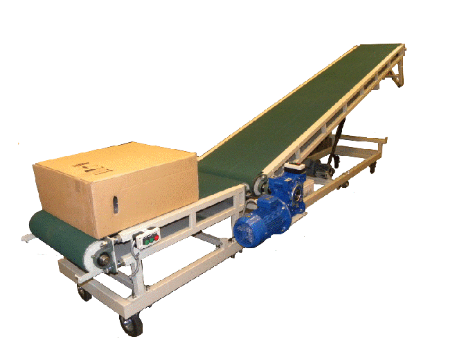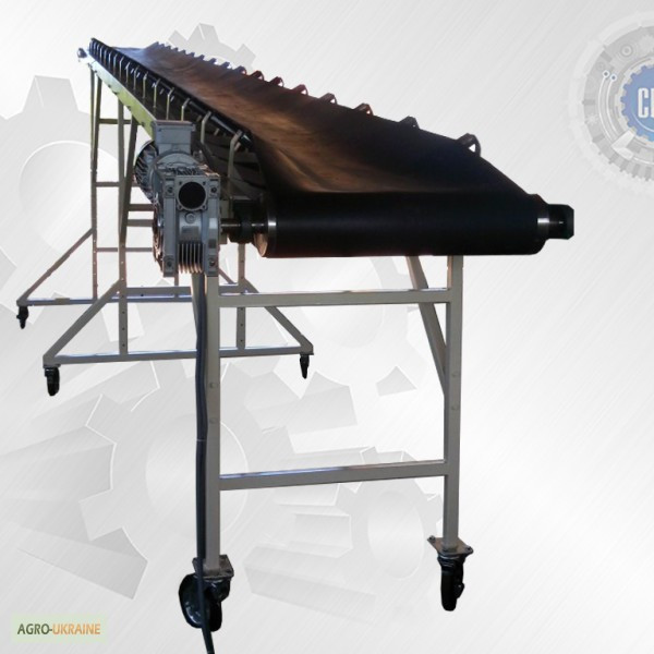 Мобільний транспортер на колесах з поліамідними колесами та гальмом представляє собою підйомний конвеєр завдовжки 1900 мм від осі барабанів. Ширина стрічки становить 400 мм, з бортами висотою 70 мм. Конвеєр має можливість регулювання висоти від 450 до 650 мм по верхньому краю бортика в нижній частин...