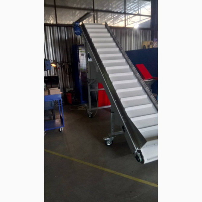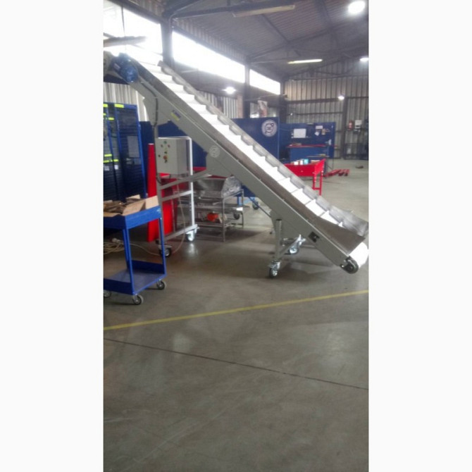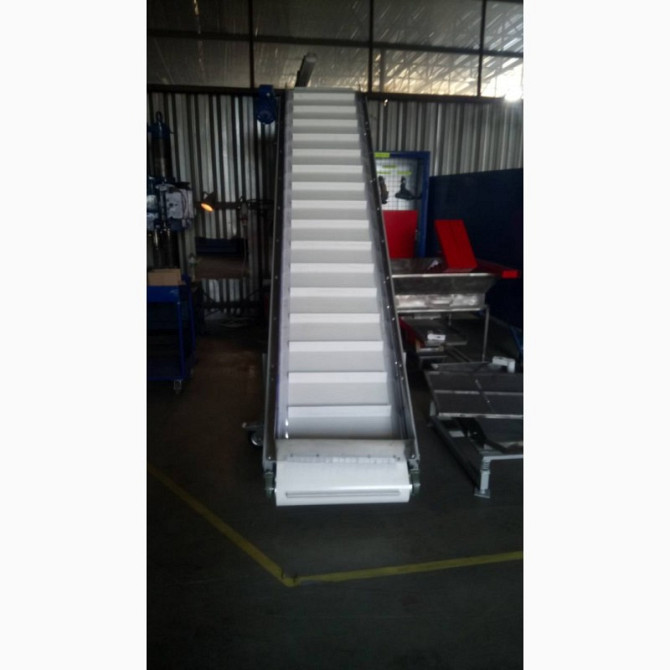 Устаткування розроблене для вертикальної подачі сировини на визначену відстань. Висота підйому становить 2300+/-, а виливка пристосована до відведеного обладнання в лінії. Кут нахилу становить 35°. Лента поліуретанова з шевронами, призначена для використання в харчовій промисловості, має білий колір...