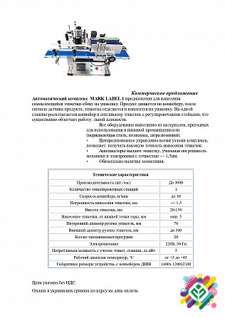 Автоматичний комплекс MARK LABEL 1 призначений для нанесення самоклейної етикетки збоку на упаковку. Цей продукт є ідеальним рішенням для автоматизації процесу наклеювання етикеток на упаковку в промисловості. Принцип роботи комплексу полягає в тому, що після сигналу датчика продукту, етикетка відд...