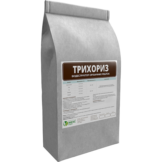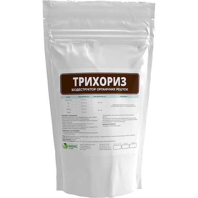 Трихориз - це комплексний мікробно-ферментний препарат для прискорення процесу гуміфікації і мінералізації рослинних залишків та оздоровлення ґрунту. Препарат вносять по подрібненим пожнивним решткам відразу після збору урожаю. Склад препарату: - Bacillus ssp. з загальним титром не менше 1х10^9 КУО...
