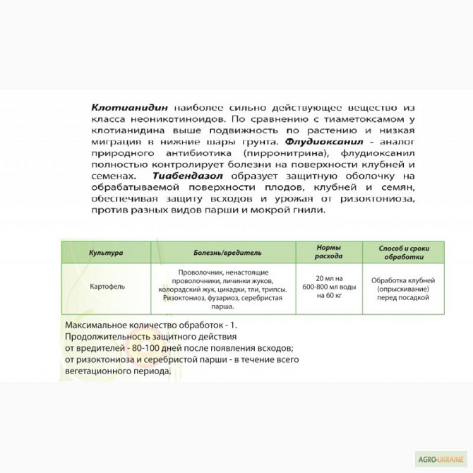 Клотианидин у концентрації 200 мл/л, флудіоксоніл у концентрації 50 мл/л, тіабендазол у концентрації 50 мл/л - це трьохкомпонентний протравник для картоплі та інших культур. Захисний період становить 90 днів. Розхід - 20 мл на 60 кг посадкового картоплі. Штрих-код продукту: 4823073723463. Даний пр...