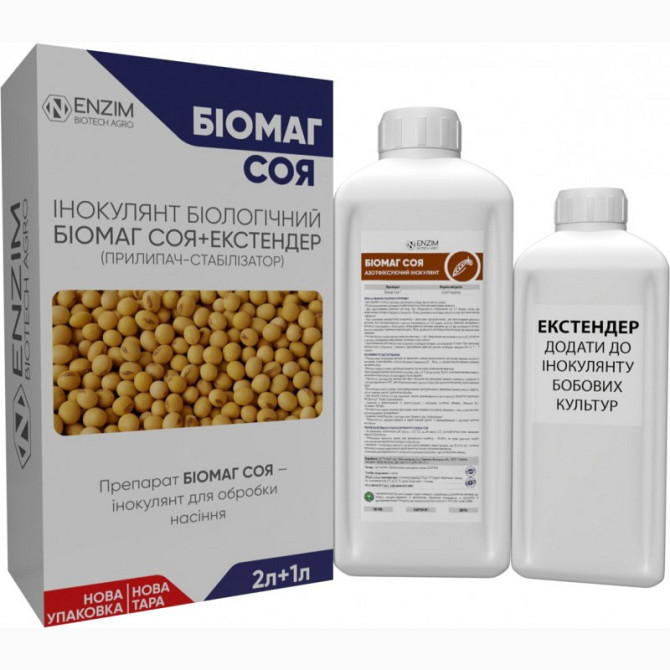 БіоМАГ Соя - двокомпонентний рідкий препарат для передпосівної інокуляції насіння сої, що містить інокулянт і екстендер. Інокулянт створений на основі культури бульбочкових бактерій Bradyrhizobium japonicum штаму LZ21 та LZ18-ГМ з титром не менше 5х10^9 КУО/мл, а також продуктів їх метаболізму, таки...