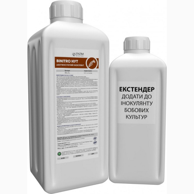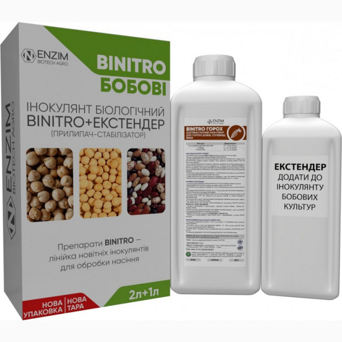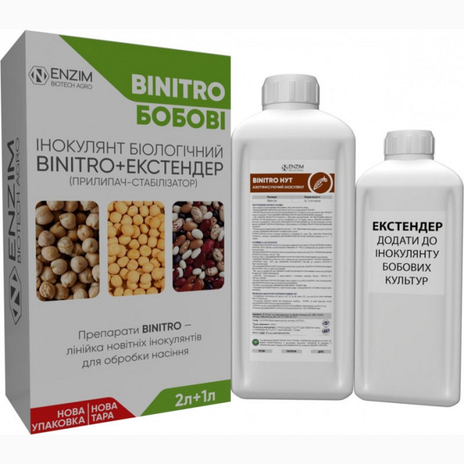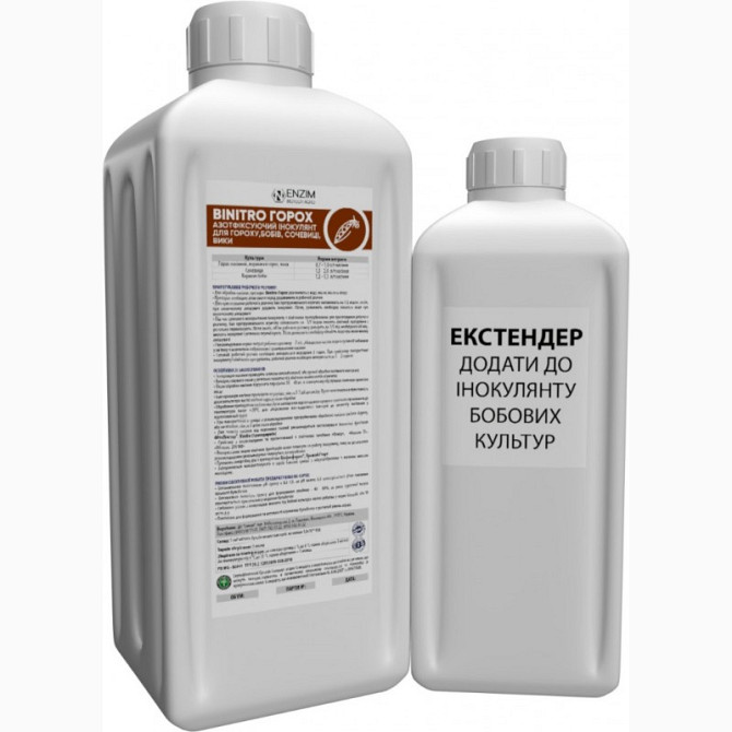 BiNitro Горох - це двокомпонентний рідкий препарат для передпосівної інокуляції насіння гороху, бобів та сочевиці. Цей препарат складається з інокулянту та екстендера, які містять культуру бульбочкових бактерій Rhizobium leguminosarum штаму RL45 з титром не менше 1х10^10 КУО/мл та продуктів їх метаб...