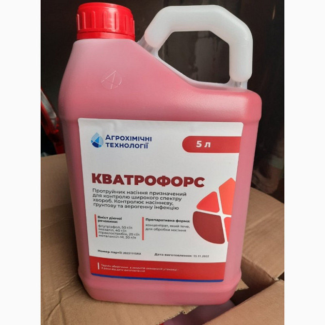 Протруйник Кватрофорс - це чотирьохкомпонентний фунгіцидний протруйник з ростовими стимуляторами, який забезпечує захист насіння та сходів пшениці та сої від широкого спектру хвороб. Вміст діючих речовин у ньому складає: флутриафол 50 г/л, імазаліл 40 г/л, металаксил-м 30 г/л та піраклостробін 20 г/...