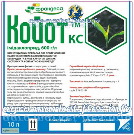 Використовується для культур: кукурудза, озима пшениця, ячмінь, картопля. Діючі речовини: імідаклоприд. Концентрація 600 г/л. "Койот" - протравник інсектицидної дії з імідаклопридом у концентрації 600 г/л. Цей протравник призначений для обробки насіння цукрової свекли, кукурудзи та зернових культу...