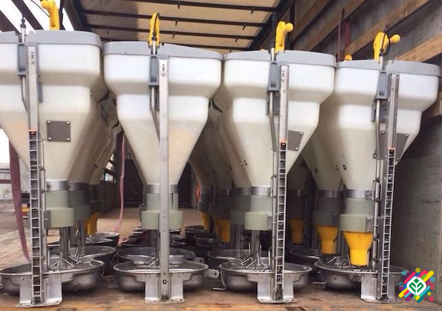 **Технічний опис продукту:** Кормовий автомат Double Swing призначений для годівлі свиней вагою від 10 до 130 кг та може обслуговувати 50-60 голів. Він оснащений подвійним бункером об'ємом 180 літрів, що дозволяє зберігати та подавати різні типи кормів. Даний автомат має можливість зволоження корму ...