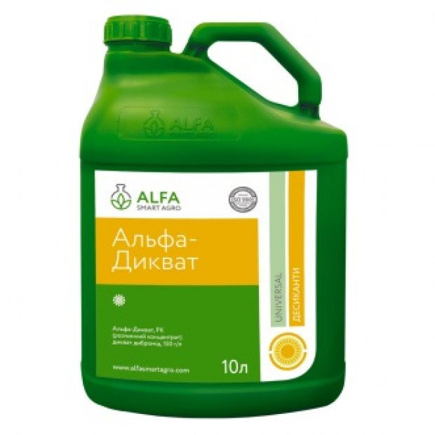 **Альфа Дикват: Контактний десикант для сільськогосподарських культур** **Діюча речовина:** Дикват, 150 г/л **Виробник:** Альфа Смарт Агро **Призначення:** Контактний десикант суцільної дії **Культури, на яких застосовується:** Соняшник, зернові культури (пшениця, ячмінь), горох, соя, ріпак, ...