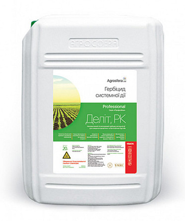 Деліт, РК - десикант-неселективний післясходовий гербіцид системної дії для знищення однорічних та багаторічних бур'янів. Діюча речовина: калійна сіль гліфосату, 613 г/л у кислотному еквіваленті - 500 г/л. Форма препарату: розчинний концентрат. Тара: 20 л., ціна вказана за 1 л. Норма витрати робочог...