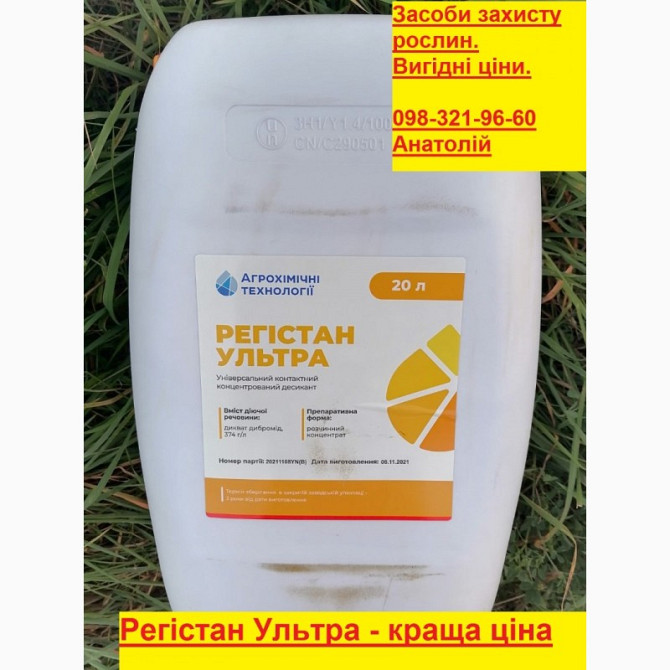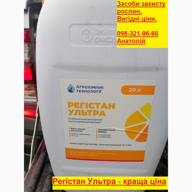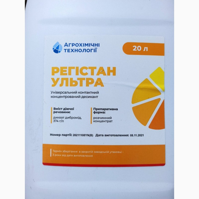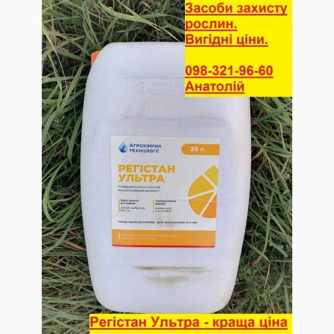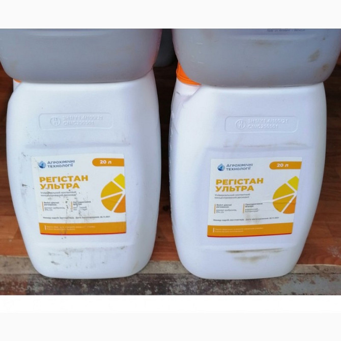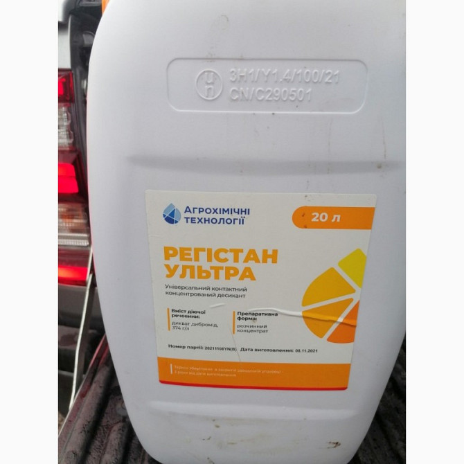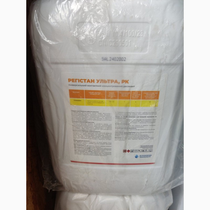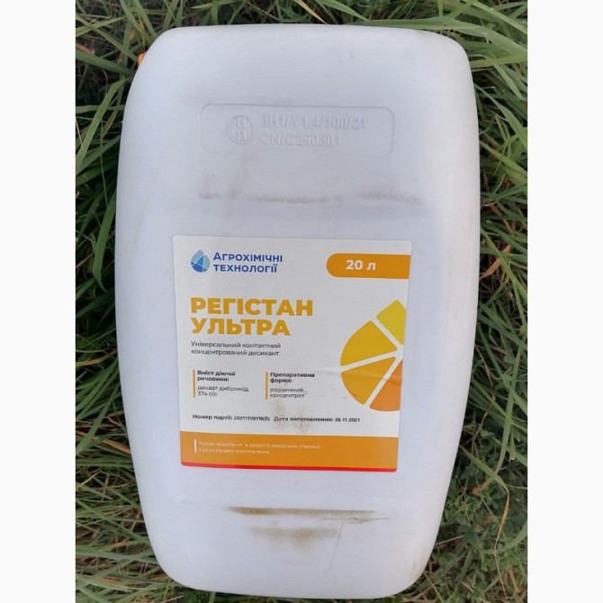 **Характеристика та застосування десиканта Регистан Ультра:** **Характеристика:** - **Форма продукту:** розчинний концентрат. - **Тара:** канистра об'ємом 20 л. **Призначення:** Регистан Ультра - це вдосконалений контактний десикант для попереднього висушування культури перед збиранням врожаю та ч...