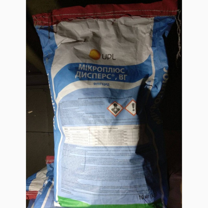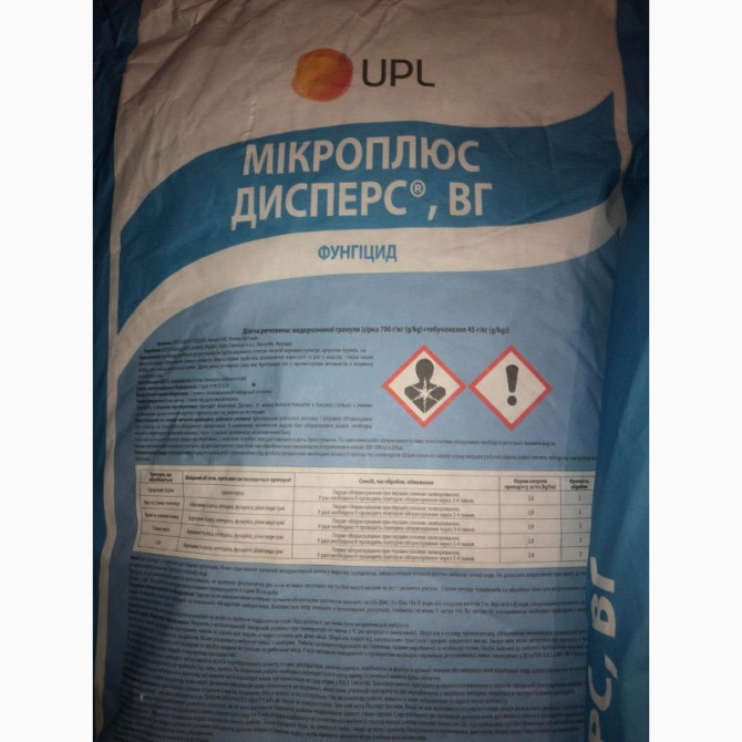 Мікроплюс Дисперс, UPL: Контактно-системний фунгіцид захисної та лікувальної дії з акарицидною дією. Діючі речовини: сірка, 700 г/кг + тебуконазол, 45 г/кг. Спосіб дії: контактно-системний. Форма препарату: водорозчинний гранульований концентрат суспензії. Хімічний клас: триазини, неорганічні сп...