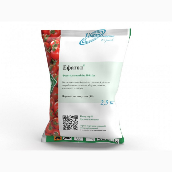 **Ефатол** – системний фунгіцид профілактичної та захисної дії для захисту винограду, кісточкових, овочевих і технічних культур від збудників комплексу найбільш шкідливих захворювань, таких як парша, несправжня борошниста роса, фітофтороз, макроспоріоз, гнилі та інші. **Діюча речовина:** Фосетіл ал...