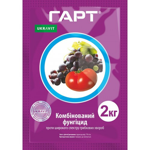 **Фунгіцид Гарт** **Опис:** Фунгіцид Гарт є контактним засобом профілактичної та лікувальної дії, який застосовується для боротьби з широким спектром грибкових захворювань на овочевих та плодових культурах. Діюча речовина - гідроксид міді, у концентрації 770 г/кг. **Характеристики:** - **Культура:...