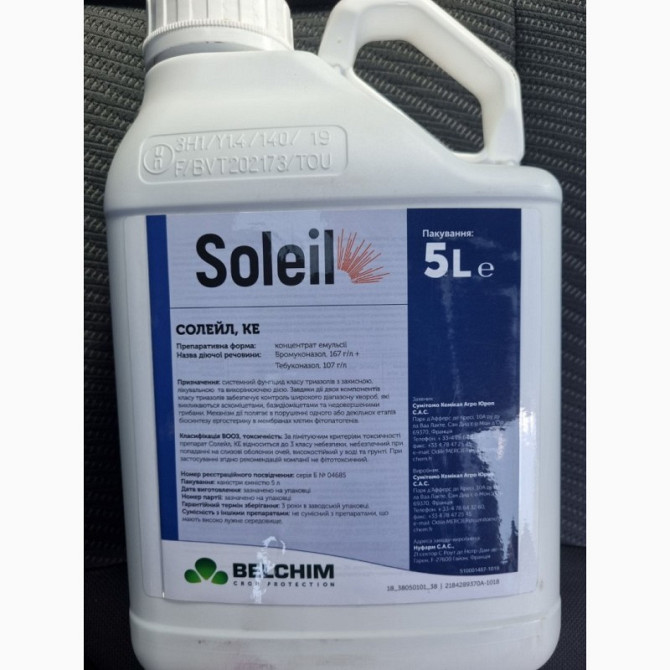 Фунгіцид Солейл - це ефективний засіб для захисту листя та колоса від хвороб. Вміст діючих речовин: бромуконазол - 167 г/л та тебуконазол - 107 г/л. Препаративна форма: концентрат емульсії. Норма витрати робочого розчину: 200-400 л/га. Упаковка: 5 л, ціна вказана за 1 л. Переваги використання Солей...