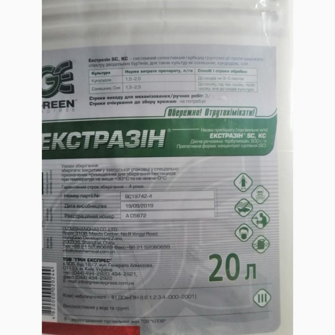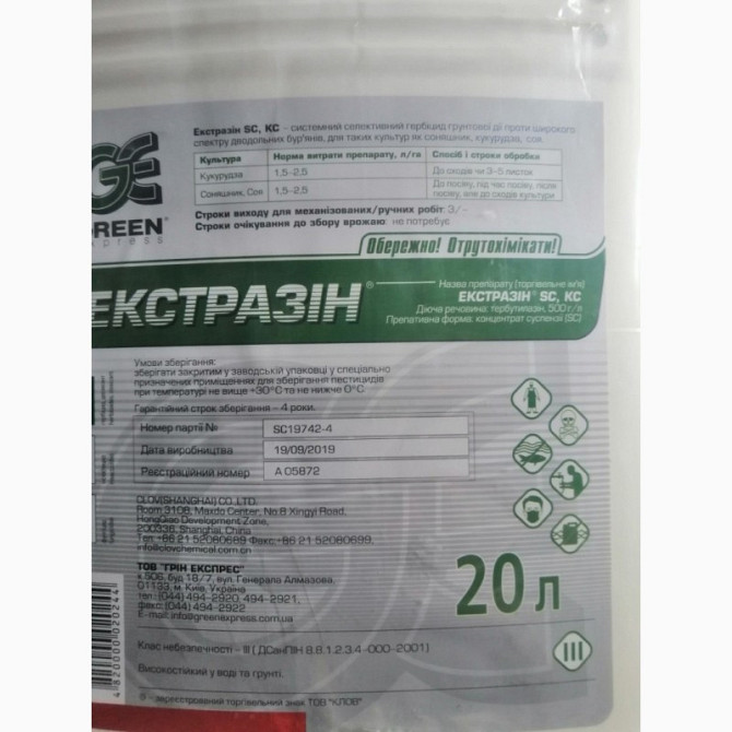 Гербіцид Екстразін є системним селективним гербіцидом грунтової дії, який бореться з широким спектром дводольних бур'янів у культурах, таких як соняшник, кукурудза, соя та нут. Вміст діючої речовини: тербуталазін, 500 г/л. Препаративна форма: концентрат суспензії. Упаковка: 20 л, ціна вказана за 1 л...