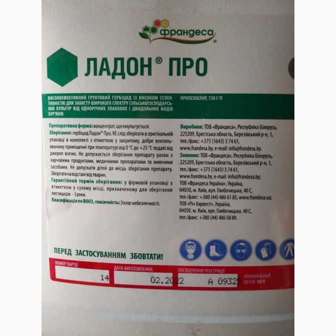 Гербіцид Ладон Про є ґрунтовим селективним гербіцидом, призначеним для захисту широкого спектру сільськогосподарських культур від однорічних злакових та дводольних бур'янів. Вміст діючої речовини в одиниці об'єму становить 720 г/л пропізохлору. Препарат представлений у формі емульгованого концентрат...