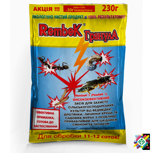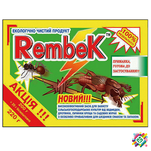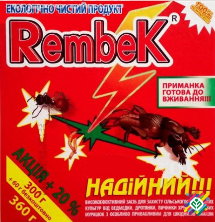 Нове високоефективне якісне засіб для захисту сільськогосподарських культур від ведмедиць, дротянок, личинок хруща та садових мурах і інших комах. Призначення препарату RembeK (РембеК): РембеК – готова приманка для боротьби з ведмедицями (вовчками, капустянками), дротянками та личинками хруща на ово...