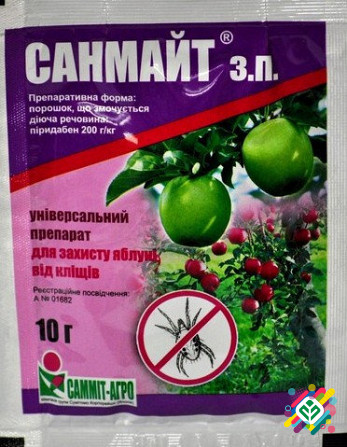 Контактний високоефективний акарицид "САНМАЙТ" бореться з кліщами на будь-якій стадії їх розвитку, зокрема з павутинними, виноградними та фруктовими кліщами. **Характеристики продукту:** - Препаративна форма: смачиваючий порошок білого або кремового кольору. - Діюча речовина: пиридабен (200 г/кг). ...