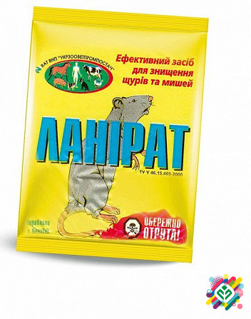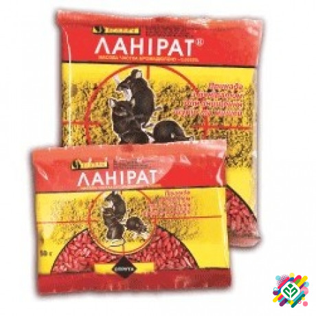 Приманка швидко споживається домашніми мишами, сірими та чорними польовими. Пагубна дія Ланирату настає вже після одноразового споживання зерна. **Діюча речовина:** бродифакум - 0.005% муміфікуючого агента. **Призначення:** Ланират має отруйну дію навіть на «стійких» до інших препаратів мишей і кр...